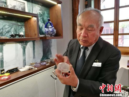 图为73岁的特级眼镜调校师章永祥介绍镜片毛坯。 胡远航 摄