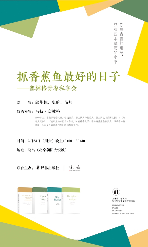 2019年是塞林格诞辰100周年,也是译林出版社成立30周年。作为塞林格作品集国内独家出版方,译林出版社首次邀请塞林格之子同时也是塞林格基金会负责人的马特·塞林格先生访华。3月23日晚上,马特·塞林格先生将来到晓岛同读者见面,并与评论家、作家邱华栋、史航、苗炜等嘉宾展开对谈。