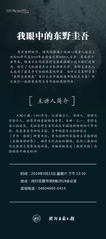 有关资料统计,国内的推理小说核心读者人数在上世纪90年代至2005年左右还只有5000人左右。然而近十余年来,随着日本作家东野圭吾的推理小说不断引进国内,吸引了大批读者关注日本推理文学,东野圭吾本人也成为了最炙手可热的现象级作者。为什么是东野圭吾?“东野圭吾现象”为什么在中国阅读市场经久不衰?今天我们跟随主讲人天蝎小猪一起探索东野圭吾作品的奥秘所在。