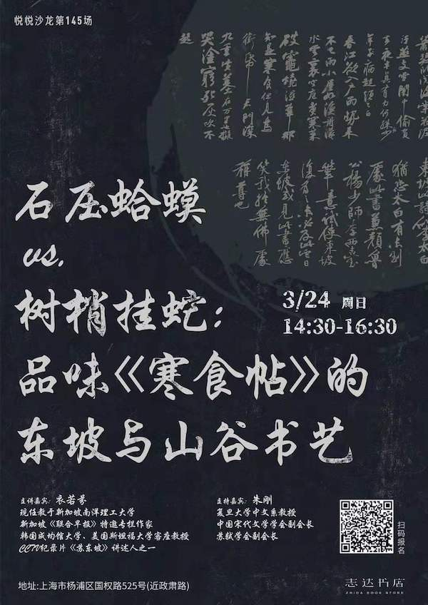 苏轼和黄庭坚都凭借书法成就跻身“宋四家”之列,两人既相互欣赏,也偶尔相互戏谑调侃,彼此心意相通。东坡形容山谷的字“有时太瘦,几如树梢挂蛇”,山谷则说东坡的字“间觉褊浅,亦甚似石压蛤蟆”。志达书店与上海古籍出版社共同邀请海外名校人气教授衣若芬,以《寒食帖》的东坡诗和山谷题跋为例,为我们详尽地分析“石压蛤蟆”和“树梢挂蛇”的美感形态和意涵旨趣。