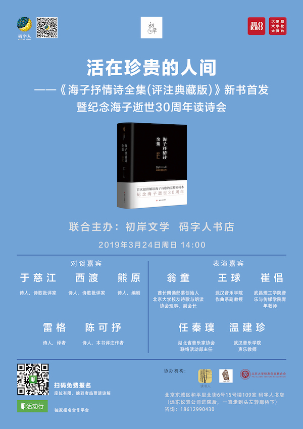 在短暂的生命里,他憧憬,面朝大海春暖花开;他梦想,从明天开始,做一个幸福的人;他感叹,在这珍贵的人间,太阳强烈,水波温柔。3月24日,是他的生辰,而他的忌日,仅仅一天之隔。生于3月,死于3月,在25个3月的轮回之间,他奉献出了,远比许多人的一生还要丰富的诗篇。3月24日下午,让我们相约码字人书店,一起读诗,一起缅怀。