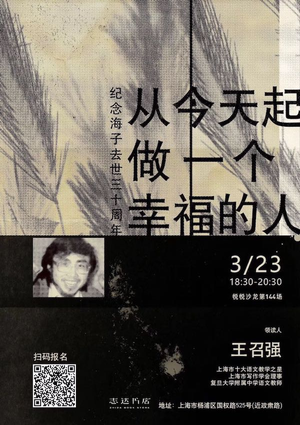 3月24日,是诗人海子的生辰。而今年的3月26日,则是他去世三十周年的纪念日。为此,志达书店邀请到复旦附中的王召强老师,来给大家领读海子的诗歌。