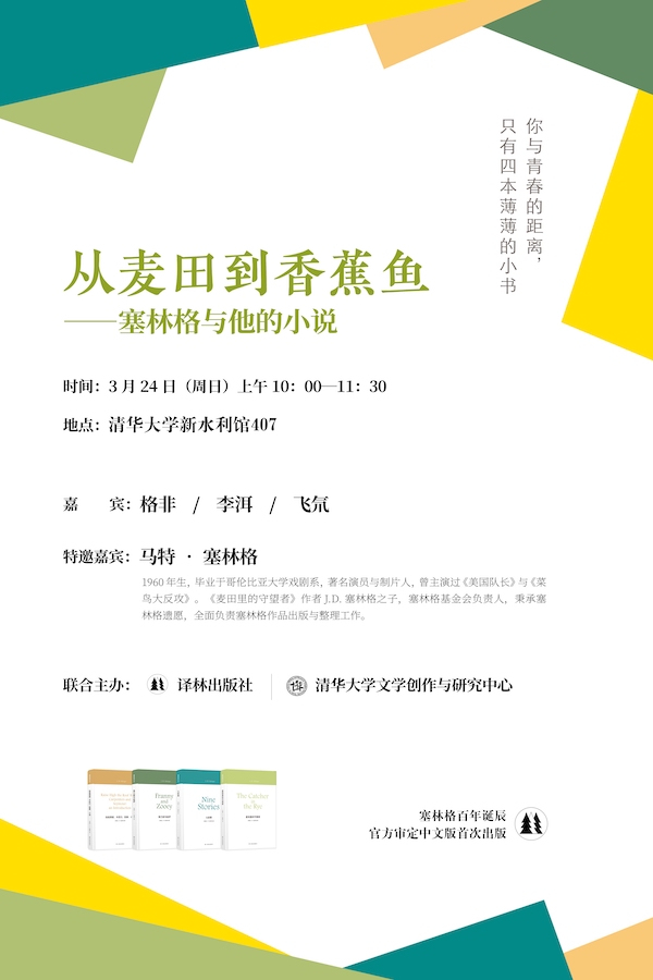 3月24日上午,马特·塞林格的最后一场公众活动在北京清华大学举行。届时,他将与作家格非、李洱、飞氘等嘉宾以及读者朋友们展开交流,分享他眼中的父亲和小说创作。