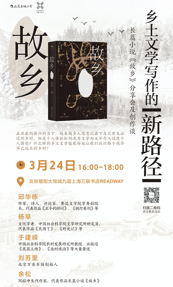 20世纪中国的乡土文学很大程度上记录了我们这个国度的时代流变,它们或以强戏剧性的故事笔法呈现底层农民的生活遭遇,或以魔幻现实之笔摹画少有人知的奇谈密史,皆让我们看到不一样的乡土景观。在非虚构渐兴的当下,越来越多人愿意记录下自己曾见证过的乡村,但是个人体验如何成为文学而又不介入过度个人情感?什么样的乡土文学能更好地让我们认识那个或许早已远去的乡村?我们邀请了邱华栋、杨早、于建嵘、刘苏里几位老师,与《故乡》的作者余松,一起聊聊《故乡》,聊聊乡土文学写作的新路径。