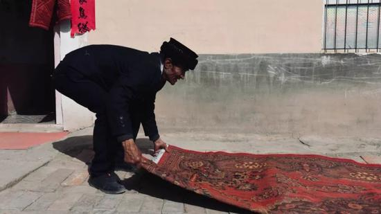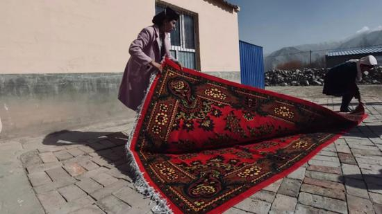 “黎明即起,洒扫庭除”。肖贡巴哈尔节之前,热依木巴依的妻子和女儿要一起将屋里屋外打扫干净。她们会仔细清洁保养家中最特殊的“家具”——地毯。掸去过去一年的尘土,便意味除去了过去一年所有的“污垢”。精巧的手工和极具传统特色的花纹,又重新焕发出鲜艳的色彩。