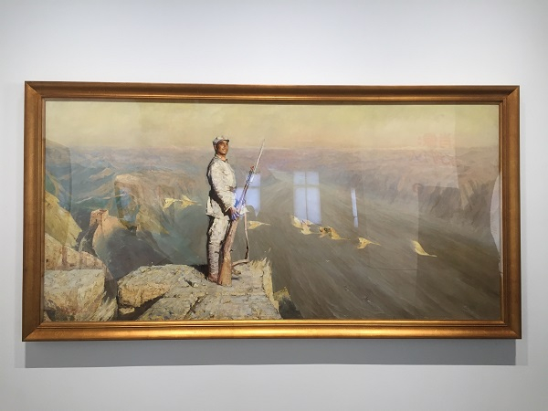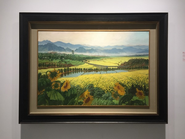 《战地黄花分外香》创作于毛泽东主席逝世一周年之际,吴作人取毛泽东《采桑子‧重阳》词意创作了此作,在毛泽东词中所描述的“黄花”,在画中主要由油菜花和向日葵加以表现。艺术家以国画选景立意的方法对客观的物像加以主观编排,用两种不同季节的作物,模拟出一个超越自然时令的“金色季节”。将油画写生的真实和国画“搜尽其锋打草稿”的写意完美融合。这件作品可视为吴作人油画民族化探索上风景题材的代表之作。 蒋竹韵,《全景与凝视》,2018