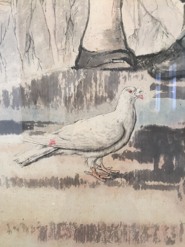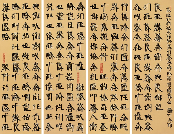 “新英文书法”是艺术家徐冰将英文字母的书写方式中国化,形成的一种新的文字,保留汉字的方块结构和中国古典数牌文字书写形式。他以“新英文书法”书写了毛泽东在1942年发表的在《在延安文艺座谈会上的讲话》,在跨文化的语境中重现历史。  蒋兆和,《中国人民从此站立起来了》,1949  蒋兆和,《中国人民从此站立起来了》立体感呈现的细部