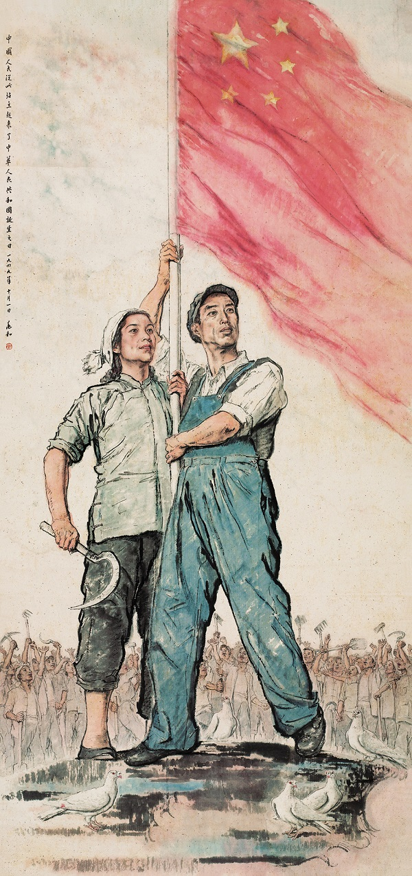《中国人民从此站立起来了》是蒋兆和仅次于《流民图》的一件大尺幅作品,画面中的皴法与渲染技法已经跳脱传统中国水墨画的笔法。画家齐白石曾称赞这件作品“能用中国画笔加入外国法内,为中外特见”,画面中传达出“为表现新中国而努力”的艺术家立场,也是个人叙事与国家叙事之间的互动。