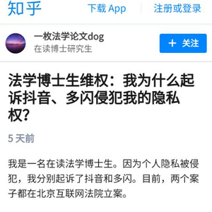 3月15日起,一篇名为《法学博士生维权:我为什么起诉抖音、多闪侵犯我的隐私权?》的文章,出现在知乎微博等社交平台,文章作者博士生小凌向紫牛新闻记者谈了自己起诉的经过。