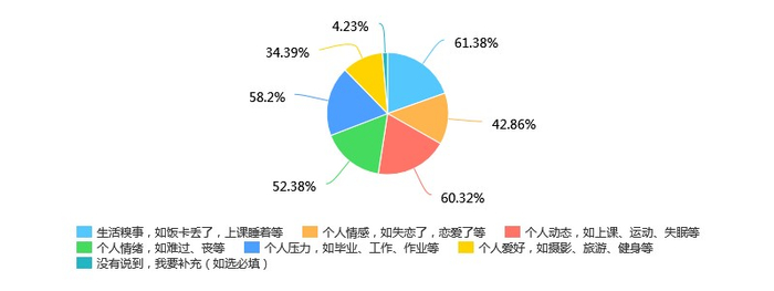 问卷显示,高校“夸夸群”互动中主要的求夸内容集中在“生活糗事,如饭卡丢了,上课睡着等”,其次是“个人压力,如毕业、工作、作业等”。