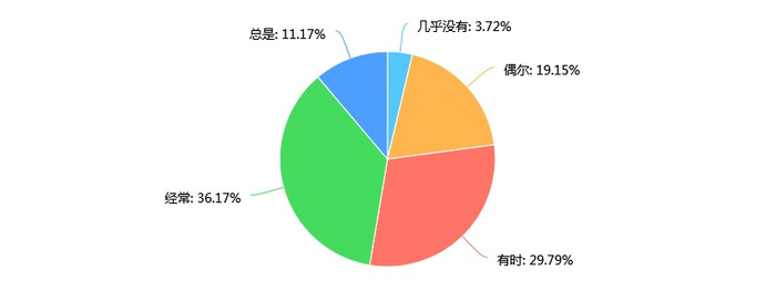 “夸夸群”内的成员是否会在现实中对周围人进行夸赞?有36.17%的群内成员选择“经常”在现实中对周围人进行夸赞,29.79%的群内成员选择“有时”。