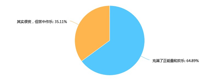 对于“夸夸群”内的互动内容,64.89%的人认为群内“充满了正能量和欢乐”,35.11%认为“其实很丧,但苦中作乐”。