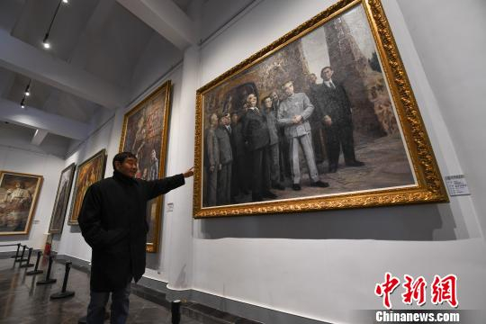 图为朱孟麟在为记者讲述油画作品《蓬皮杜参观云冈石窟》的故事。 胡健 摄