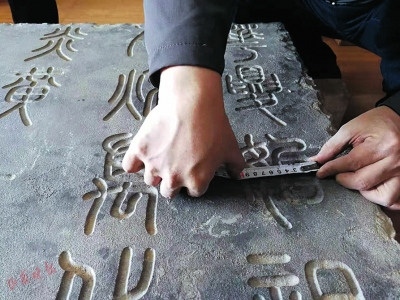 王永忠找来两根圆柱形小木棒,蹲在地上,在石碑的表面轻轻扣敲起来,伴随着连续不停的敲击,石碑发出阵阵悦耳的声音。有趣的是,轻轻敲击石碑,四周边沿发出的声音比石碑中心的声音更加清脆悦耳。山西晚报记者试着用手指轻扣石碑表面,石碑也发出了叮叮咚咚、高低不同的音阶。“这是一方用灵璧石雕刻的石碑,在古代是比较稀缺名贵的石材。”王永忠说,“过去,灵璧石主要是达官贵人的玩赏之物,古代的乐器‘磬’,就是用灵璧石制作的。”