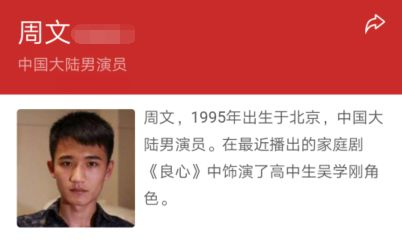 周文于1995年出生于北京,中国大陆男演员。在最近播出的家庭剧《良心》中饰演了高中生吴学刚角色。12岁时出演了电视剧《西出阳关》,剧中饰演了一个流浪儿童张小泉的角色。2008年由他主演的公益慈善电影《爱的天空下》在电影频道多次播出,由此为大众所熟知。此后出演了多部电影电视剧《青春敬礼》《青岛往事》《你是我的生命》《我叫汪革革》等等。