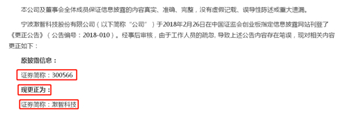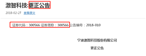 公司名改对了,本以为一场闹剧就这么结束。令人苦笑不得的是,更正公告中证券简称本该是激智科技,没想到从“张彦”被改成了“300566”。公司不得已,再发更正公告。