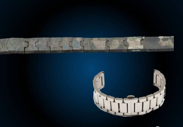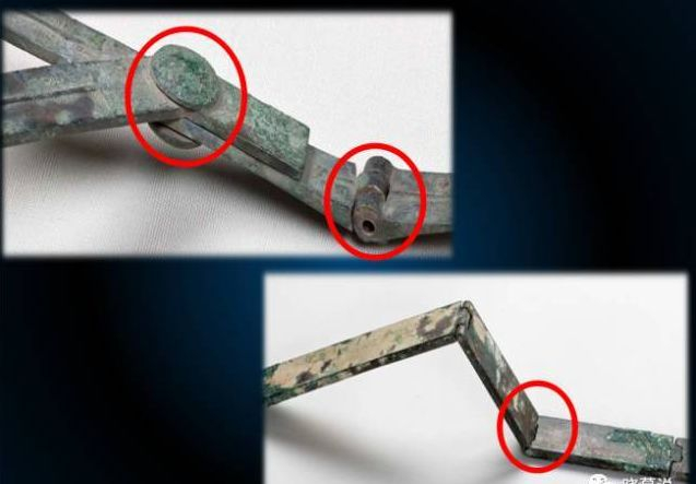再来看个神奇的地方,这是辔绳的局部,是由青铜片一小节一小节地加工而成,在连接的地方,可以灵活转动,这是不是和我们现在生活中手表的金属表链有着高度的相似? 其实它是采用了子母扣连接加销钉连接的技术,简单的来说,就是把不同的金属构件做成子母口,相互咬合,然后中间钻孔,穿上销钉,这样就可以使其曲展自如了。