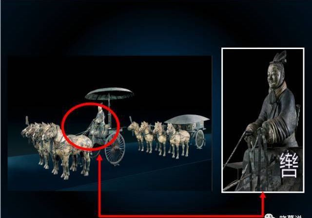 《诗经》里也有“四牡孔阜,六辔在手”的诗句。 可是辔到底是什么样子,谁也没有见过。秦始皇陵封土西侧出土了这两乘青铜马车,使我们可以清楚地看到辔的真实样子。 位于红色圆圈的部位,就是铜车马上的辔,是使马车转向或停止的重要零部件。