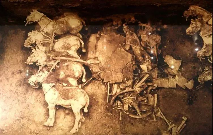 在青铜马车被重新发掘的1980年,呈现在考古专家眼前的是厚重泥土中的3000多块碎片。这是因岁月变迁,上层的填土塌压造成的。 |翻拍的被厚重泥土压成碎片的立车历史影像|