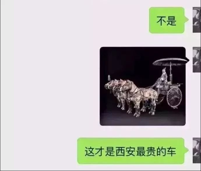 没错,这位朋友祭出的正是“秦始皇陵铜车马”,如假包换的“秦始皇的车”,于1980年出土于陕西省临潼秦始皇陵封土西侧,现藏于西安秦始皇兵马俑博物馆,售价——估计没人敢估。