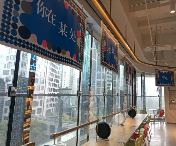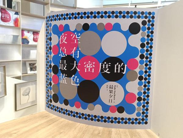 除了艺术品,书籍本身也成为展示对象。《夜空总有最大密度的蓝色》书封变身海报,书中的金句也变成文艺“标语”,成为书店装饰的一部分。