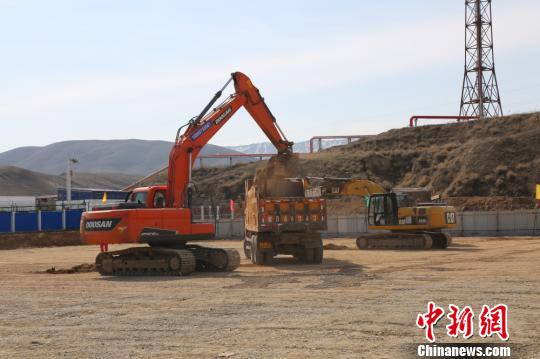 图为玛河气田增压及深冷提效工程开工仪式上大型机械动工。 蔺媛 摄