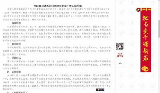 前述失独家庭人员提供给澎湃新闻的截图显示,这份文件名为《井陉县卫计系统扫黑除恶专项斗争实施方案》,是根据《井陉县开展扫黑除恶专项斗争实施方案》(井发〔2018〕4号)和市卫计委印发的《全市卫生计生系统扫黑除恶专项斗争实施方案》要求而制定。