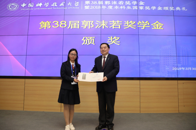 郭沫若奖学金是中国科学技术大学本科生的最高荣誉奖学金。1980年2月,经国务院批准,我校首任校长郭沫若生前交托中国科学院党组的稿费被用于设立“郭沫若奖学金”,用以激励莘莘学子努力攀登科学技术高峰。郭沫若奖学金是新中国第一个以个人命名的奖学金,在国内外享有崇高的声誉,是每一位科大学子梦寐以求的最高荣誉。38年来,共有850名本科生和95名研究生获此殊荣。本年度获得郭沫若奖学金的33名本科生将全部到国内外一流高校或研究机构深造。国家奖学金是2002年设立的级别最高的奖学金,奖励德智体美劳全面发展的优秀学生。我校两个奖项的历届获奖者在科研、教育、金融、IT等领域累出成就,群星璀璨,赢得了社会广泛的赞誉和认可。
