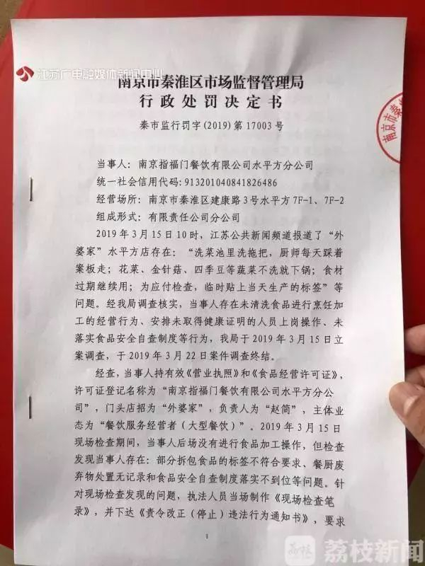 此前,“外婆家”南京水平方店被曝出,在洗菜池里洗拖把、厨师每天踩着案板走;食材过期继续使用;为应付检查,临时贴上当天生产的标签等问题。针对这些问题,秦淮区市场监管局于3月15日立案调查,于3月22日案件调查终结。3月29日,现代快报记者从南京市秦淮区市场监管局了解到,该局已下发行政处罚决定书。