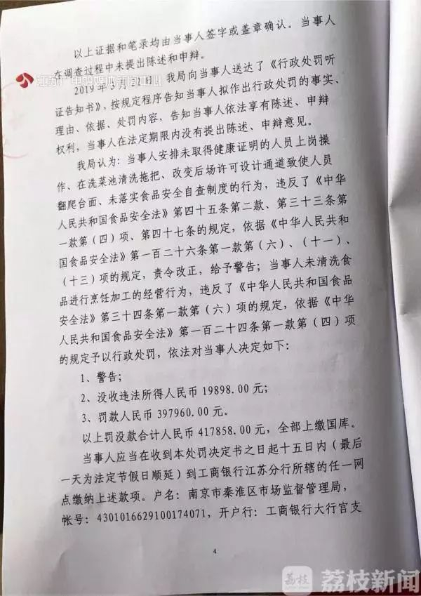 因此,秦淮区市场监管局依法对当事人予以行政处罚:1.警告;2.没收违法所得人民币19898元;3.罚款人民币397960元。以上罚没款合计417858元,全部上缴国库。