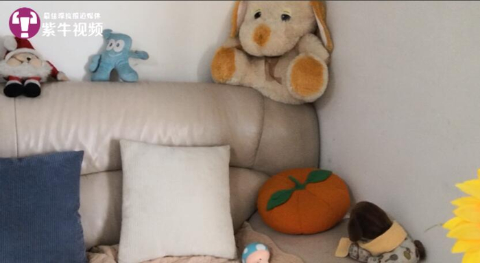 房丽的家位于小区僻静的位置,进入家门却是另一幅景象。屋内客厅和餐厅相连,但是沙发、餐桌、电视柜等大件物品都被挤到了几个角落,屋内空出了大块的“空地”。除了墙上悬挂一些书画装饰物外,屋内大部分生活用品都是卡通造型,大大小小的公仔玩偶或是成排立在沙发上沿、或是悬挂在阳台飘窗和茶几旁塑料装饰树上。