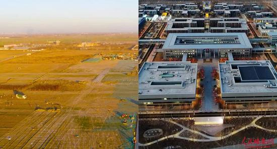 △雄安市民服务中心建设前后。(左图为中建三局提供,右图杨亚文摄)