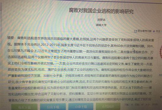 此前,云南财经大学某教师发帖称,2017年3月,她以“腐败对企业逃税的影响效应研究”为题,申请了国家自然科学基金项目,同时,该项目也是她的博士论文选题。发帖教师贴出刘梦洁与其论文的查重结果,显示总重复字数为15626字,单篇最大重复字数为7293字。对此,发帖教师向国家自然科学基金委员会和湖南大学反映情况,表示3月25号是其博士论文提交查重评审的最后日期,希望他们在该日期前尽快处理此事。