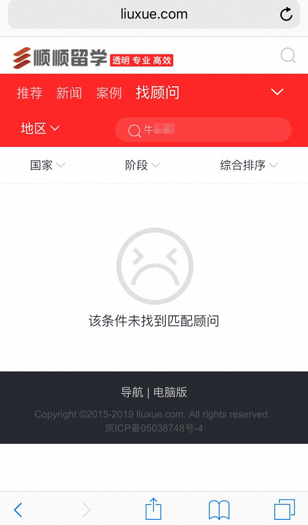 随后,澎湃新闻记者在顺顺留学官网上“找顾问”栏目里搜索牛顾问的全名,没找到匹配顾问,按照顺顺留学官网400电话致电询问,客服表示,没有这位牛顾问。