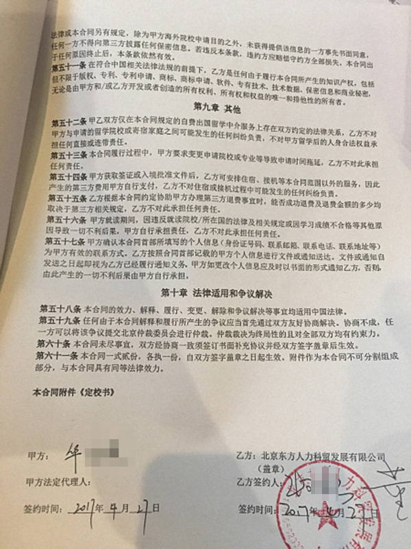 “学生你签的是北京东方人力科贸发展有限公司,投诉的事情由北京相关老师对接,这是我们公司的安排。”上海分公司的朱姓负责人表示。