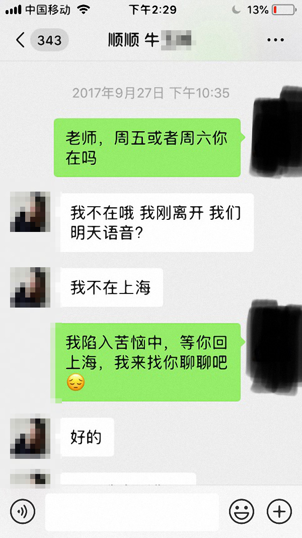 根据华同学提供的微信聊天记录显示,2017年9月,华同学提出要与牛顾问面谈,牛顾问称“我不在上海”。同年10月,牛顾问以“这两个月家里出了些事情,需要在家处理,而且还要抽空在外地培训新员工”为由拒绝了与华同学的面谈。
