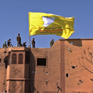 当地时间2019年3月23日,叙利亚代尔祖尔省,美国支持的叙利亚民主力量(SDF)在击败“伊斯兰国”圣战组织后,在该组织的最后一座堡垒上升起了他们的旗帜。视觉中国 图