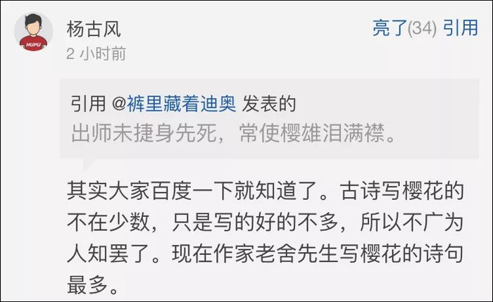 当然,还是有认真作答的朋友,指出吟诵樱花的诗歌自古有之,只是名篇较少,所以显得樱花存在感似乎不强。