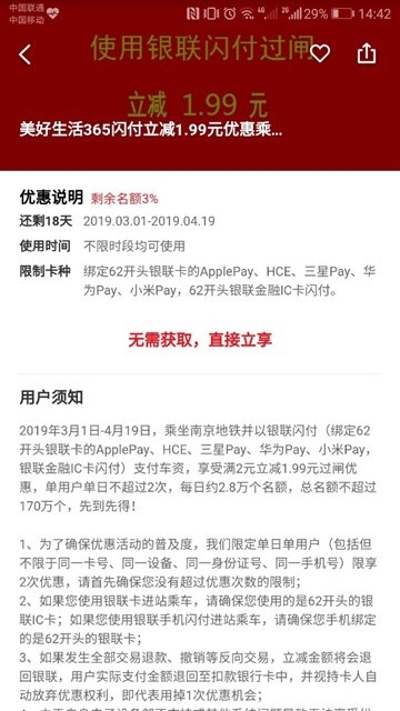 2.银联云闪付每日限额每次立减1.99元,更适合单次票价2元起步价用户