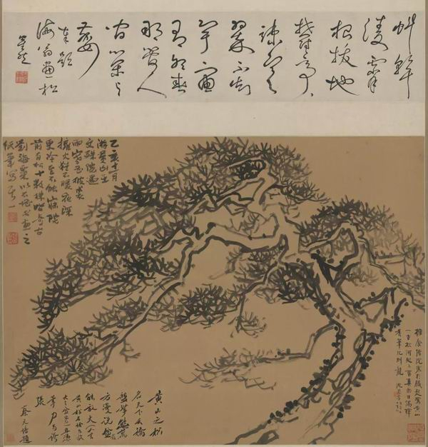 在该画的题跋上,刘海粟记录下了1935年11月,游黄山时在文殊院遇雨,加衣、烤火依旧不能寐,便以“不堪书画之纸笔”写生院前奇古松树中的一棵。