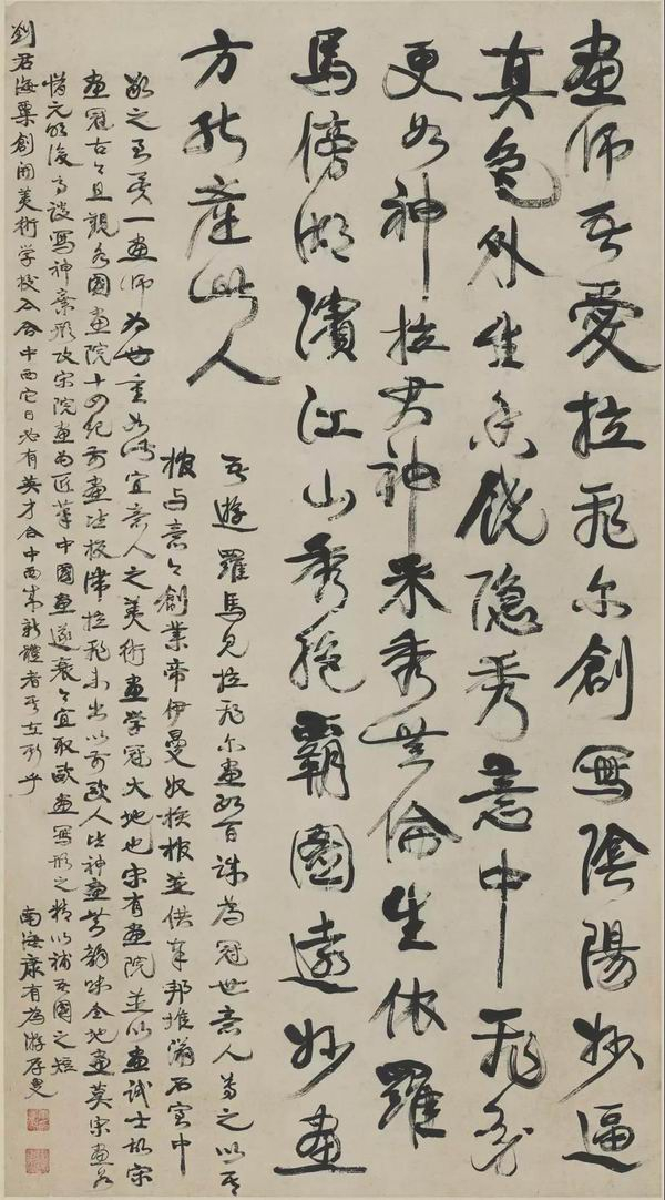 康有为的这一“良法”对于刘海粟等一批先驱艺术家影响至深。同时,康有为也对刘海粟创办的上海美专,走中西融合之路寄予了期望。康有为的诗轴上并没有落款时间,但1923 年 12 月 28 日刘海粟撰《画圣拉飞尔》一文,文中谈到康有为约其到家鉴赏藏画、赠诗。