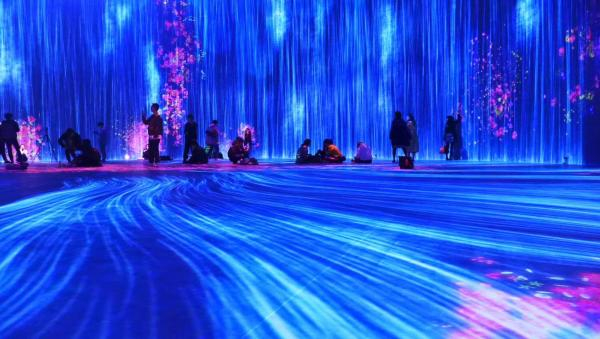 此次展览是Teamlab将《油罐中的水粒子世界,消除作品的边界》与《花与人,不为所控却能共生,消除作品的边界—度时如年》叠加呈现。