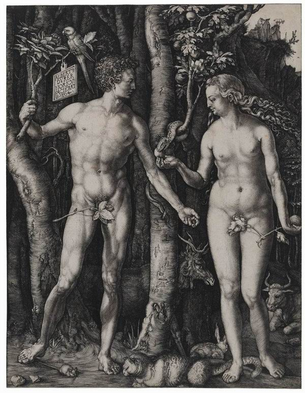 想要看出丢勒的版画《亚当和夏娃》中的成就并不容易。因为艺术家在使用另一种语言。他辛勤地用圆规和直尺度量和平衡后所取得的和谐形状不像它们的意大利和古典模特那么真实美丽。不仅在形状和姿势上,而且在构图的对称上,也有一些造作的形迹。但丢勒不像二流艺术家那样,他没有失去自身的本色去崇拜新的偶像,一旦认识到这一点,认为这幅笨拙的第一感就会消失。当他引导我们进入画中的伊甸园的时候,那里的老鼠安静地躺在猫的身旁,麋、牛、野兔和鹦鹉也不畏惧人的足音。(此段摘自贡布里希《艺术的故事》)
