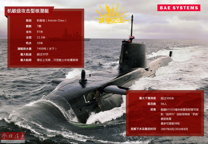 机敏级核潜艇是英国“军火巨头”BAE系统公司的王牌产品之一,由于该级艇采用了先进的自动化控制技术,艇员数可控制在百人内,此外借助最新的泵喷推进技术和降噪技术,机敏级也具有优秀的静音航行性能。图为机敏级技术参数介绍图。