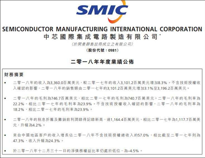 芯片制造领域依旧是大陆企业的短板。国内第一大晶圆代工厂中芯国际刚于3月29日公布2018年年度财报。数据显示,公司全年合计营收创历史新高,约33.6亿美元,同比增长8.3%;税息折旧及摊销前利润11.6亿美元,同比增长约4.2%。