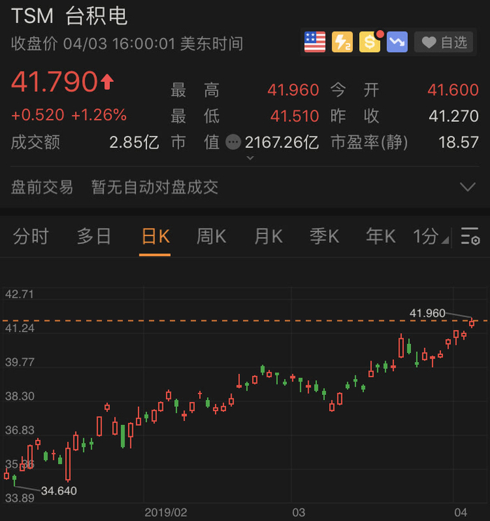 受此消息影响,台积电美股昨天高开,最终收涨1.26%,报41.79美元/股。