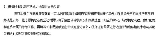 “世界上每个骨髓库都存在着一定比例的造血干细胞捐献者临捐时反悔和流失。降低流失率和反悔率的有效办法是,每一位志愿捐献者在登记时,要认真了解血液科学知识和相关常识,熟悉捐献流程,做好配偶和直系亲属的思想工作,以保证与患者配型相合时能够做到义无反顾。”