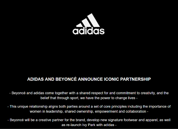 碧昂斯在新闻稿中表示:“与Adidas的合作对我来说是重要的合作关系。Adidas在推动创意边界上取得了巨大成功。我们的共同理念是将创造力、成长和社会责任放在商业的最前沿。我期待Ivy Park在全球范围内的重启和扩展。”