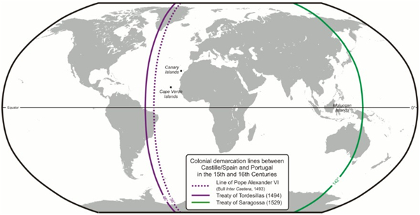1493年《托尔德西里亚斯条约》规定的子午线(紫线)以及1529年《萨拉戈萨条约》规定的子午线(绿线)