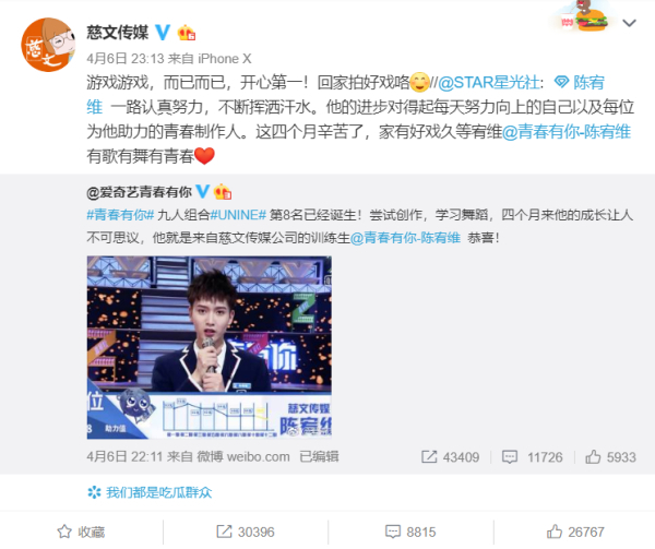 《青春有你》决赛,陈宥维排名第8出道,经纪公司在微博上明确表示不满,认为只是“游戏游戏”。如果人人将偶像选秀当做一块跳板,那么中国男团没有未来。